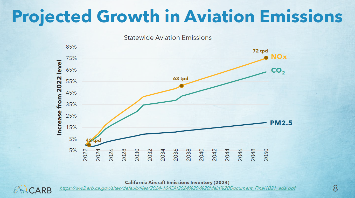 California aircraft activity is projected to increase by two-thirds through 2050, according to CARB. Without additional action, NOx emissions from the sector are projected to increase from 55 tons per day (tpd) in 2024 to 72 tpd by mid-century.