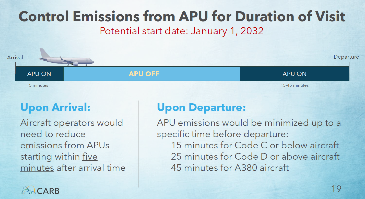 A CARB proposal would require aircraft to reduce emissions from APUs within five minutes of arrival up to 15-45 minutes before departure, depending on the type of aircraft.