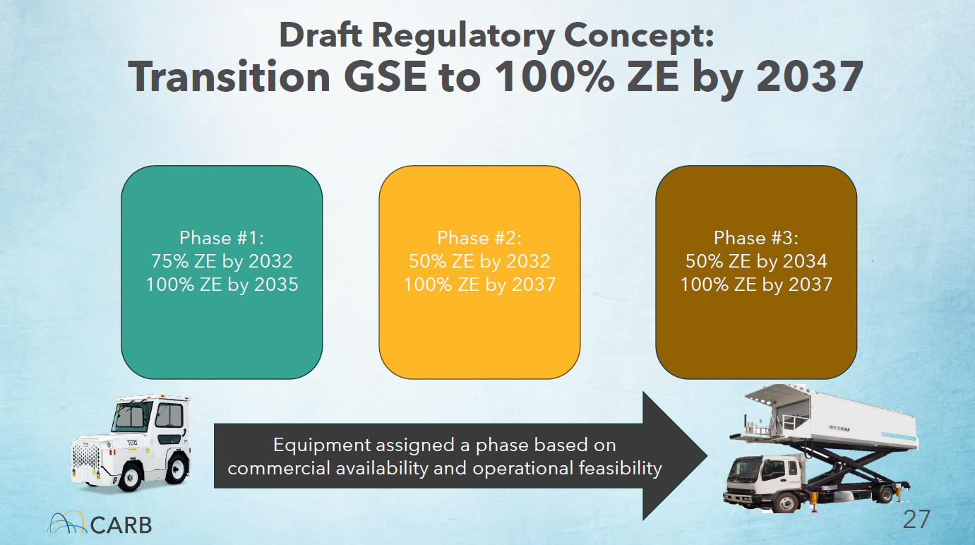 The CARB proposal for California would require a 100% zero-emission ground service fleet by 2037. Equipment would be assigned a more or less aggressive pathway to achieve that target based on the commercial availability and operational feasibility of zero-emission models.