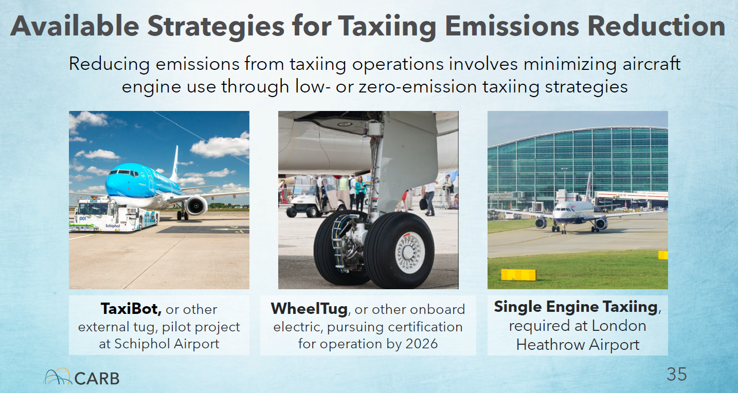 The main engines on commercial passenger airplanes burn so much fuel, it pays to turn them on only when necessary. With that in mind, CARB is proposing to limit the amount of time planes employ main engine taxiing and maximize the time of “green” taxiing between the runway and the gate.