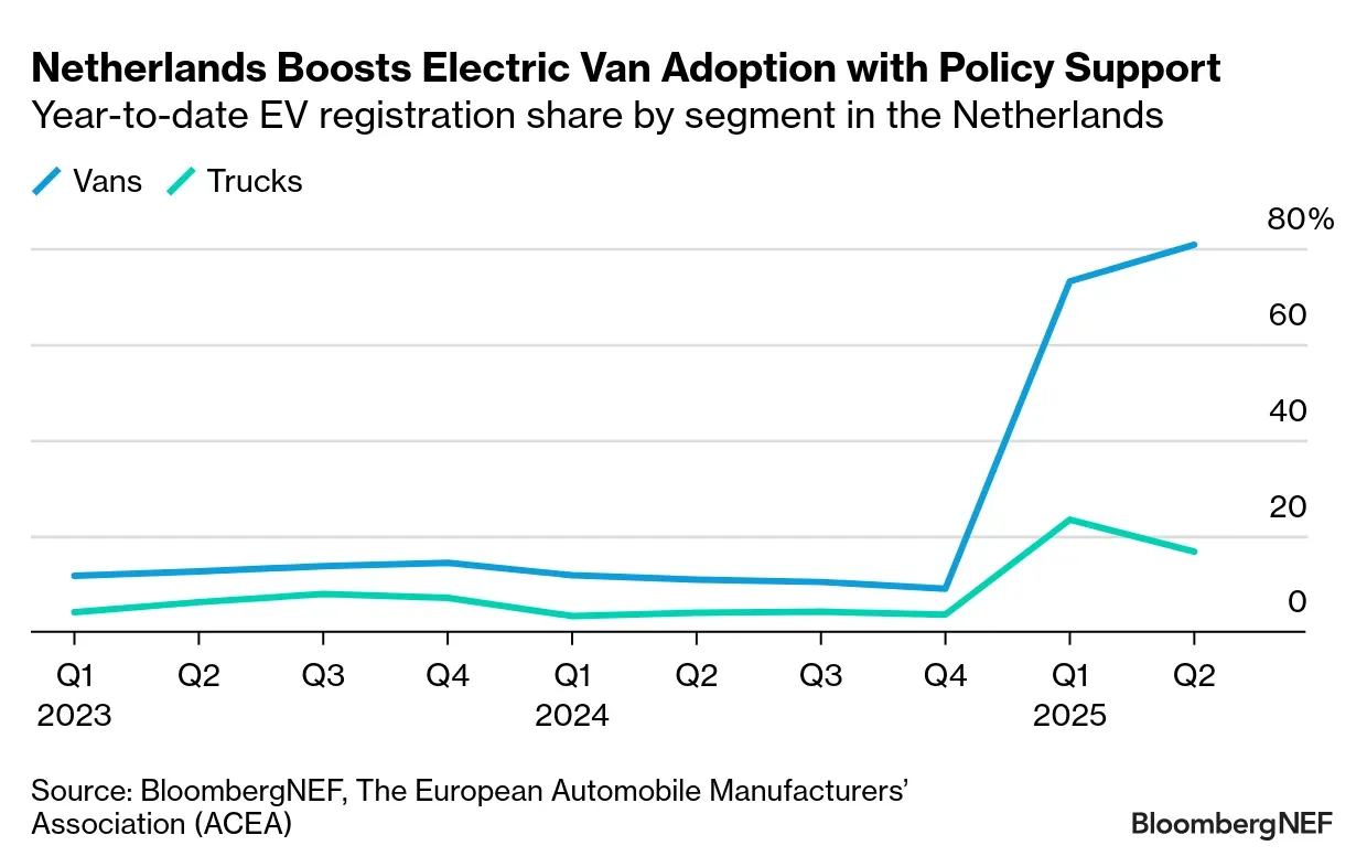 “Electric commercial van purchases skyrocketed in the Netherlands to reach more than 80% of sales in the first half of this year, the highest globally, after the government allowed municipalities to designate urban zero-emissions zones. So far, 18 cities, including Amsterdam, The Hague and Eindhoven, have introduced such zones, with 11 more in planning,” wrote Colin McKerracher, head of clean transport at BloombergNEF, in research published last month.