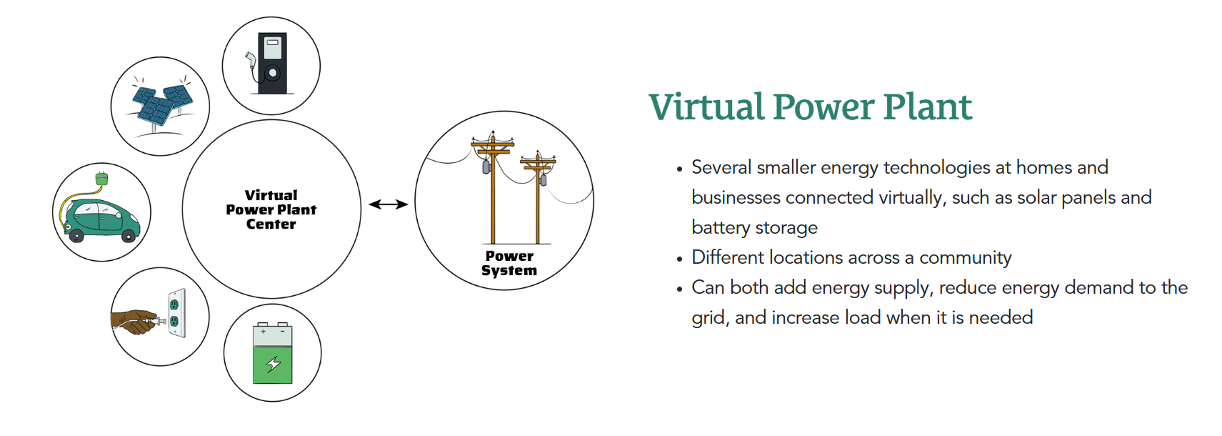 A virtual power plant aims to take those devices and sync them up so that they're working together in an optimized way. The reason the word “power plant” is in there is the idea is that these devices would become part of our generation energy mix, where they actually bring pockets of energy that are out there and untapped up into the energy markets.