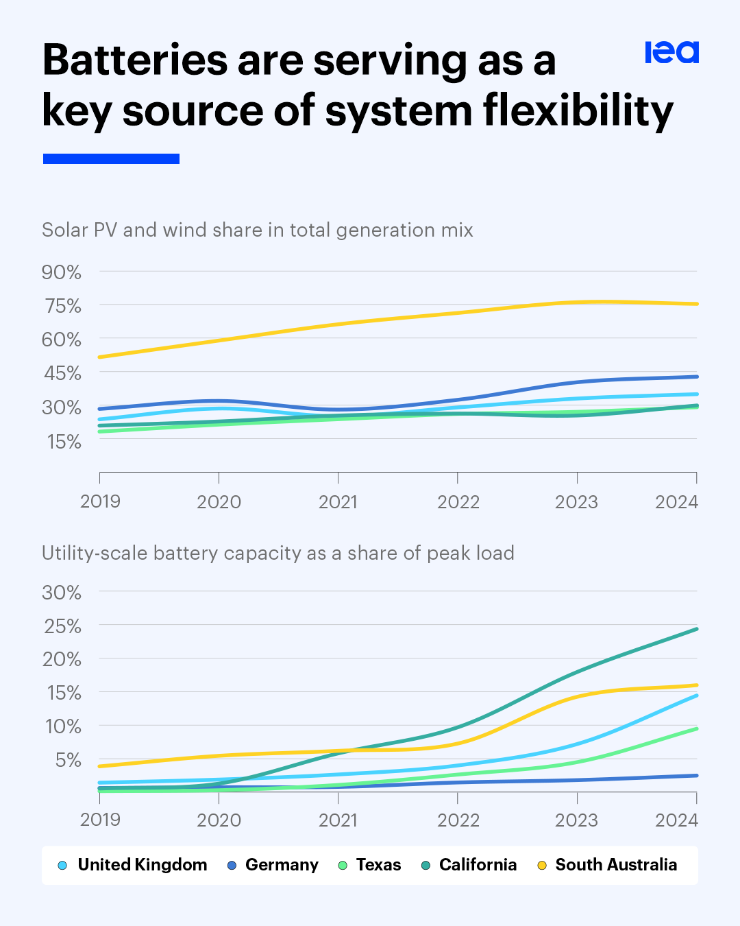 In the states and countries that are leading the global energy transition – places like California, Germany, South Australia, Texas, and the United Kingdom – more affordable utility-scale batteries are making it possible for solar and wind power to account for 30% or more of the total generation mix, with battery capacity reaching up to 25% of peak load.