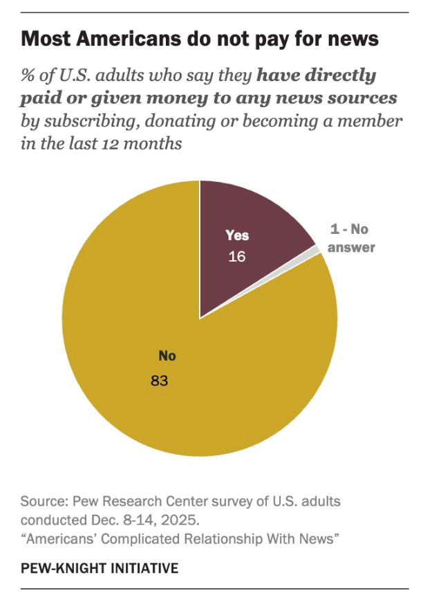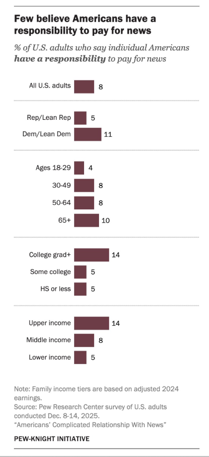 “Eighty-three percent of respondents said they did not pay for any news sources (by subscribing, donating, or becoming members) in the last 12 months. Many cited free news options as a reason not to pay. ... Only 8% of respondents believe individual Americans have a responsibility to pay for news.”