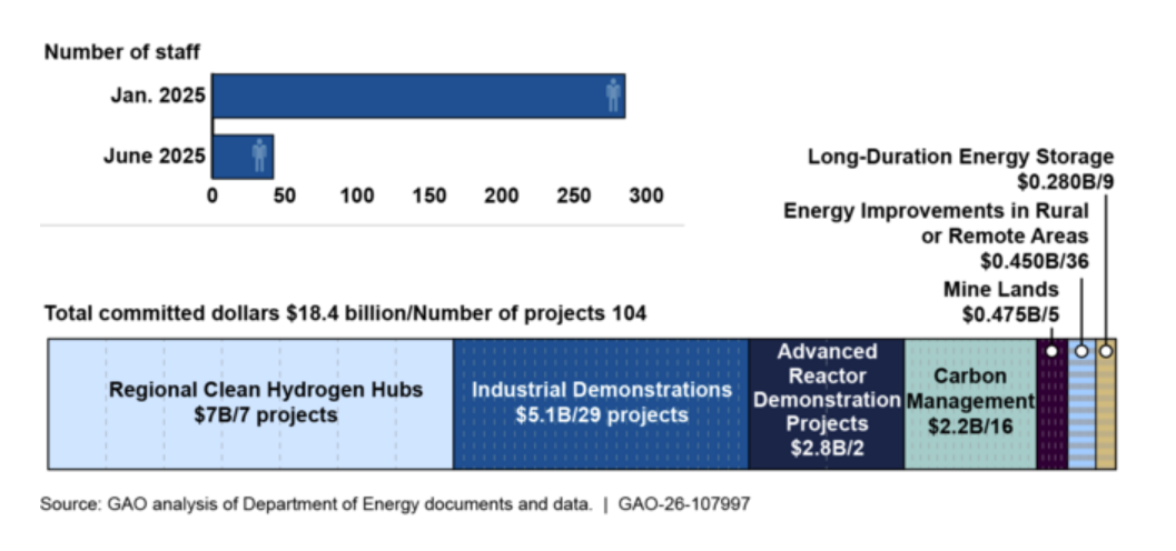 “The Department of Energy created the Office of Clean Energy Demonstrations in 2021 to manage $27 billion in funding for clean energy projects. As of November 2025, OCED had committed over $18 billion to about 100 projects. OCED needs to oversee these projects and had developed a plan to do so. However, a significant decrease in its workforce and other changes in 2025 have reduced its oversight capacity. A proposal to cut its entire budget creates further uncertainty. DOE faces the risk that it will not be able to robustly oversee these funds.”