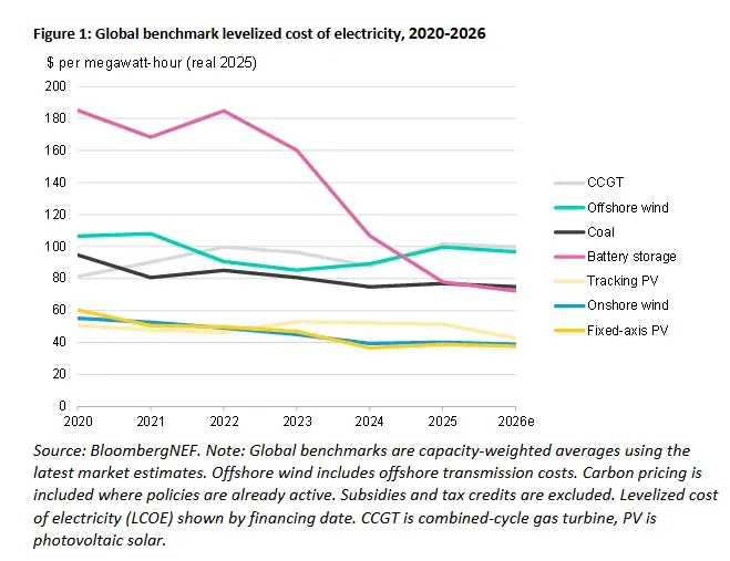 On Wednesday, research firm BloombergNEF released its 2026 Levelized Cost of Electricity report. Writing about the report at BusinessGreen, Stuart Stone reported: “The analysis of more than 800 recently financed projects found that the global benchmark cost for a four-hour battery project fell 27 per cent year-on-year to $78 per megawatt-hour (MWh) in 2025, marking a record low since BloombergNEF (BNEF) began tracking such costs in 2009.”