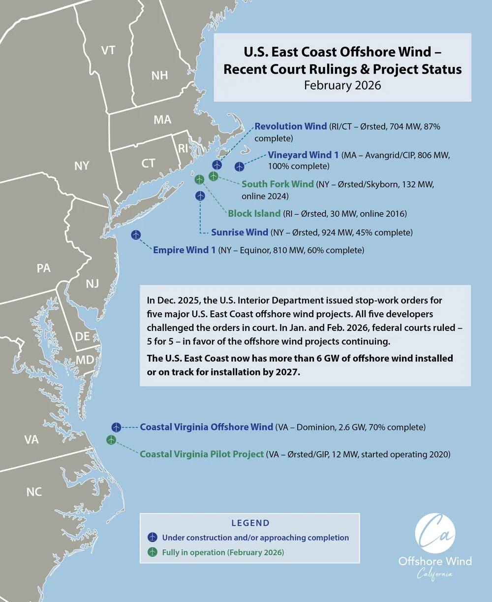 Five offshore wind farms on the U.S. East Coast are nearing completion after federal courts allowed all the projects to resume construction in rulings handed down between mid-January and early February. The U.S. Department of Interior had issued stop-work orders for the projects on December 22, 2025, a move eventually challenged in court by all five project developers.