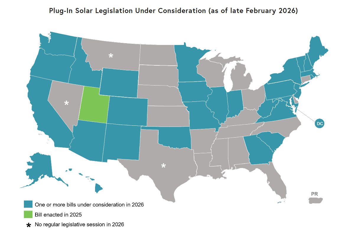 The map below illustrates how, in the intervening months, bills related to plug-in solar, also known as “balcony solar,” have been taken up in statehouses across the country.