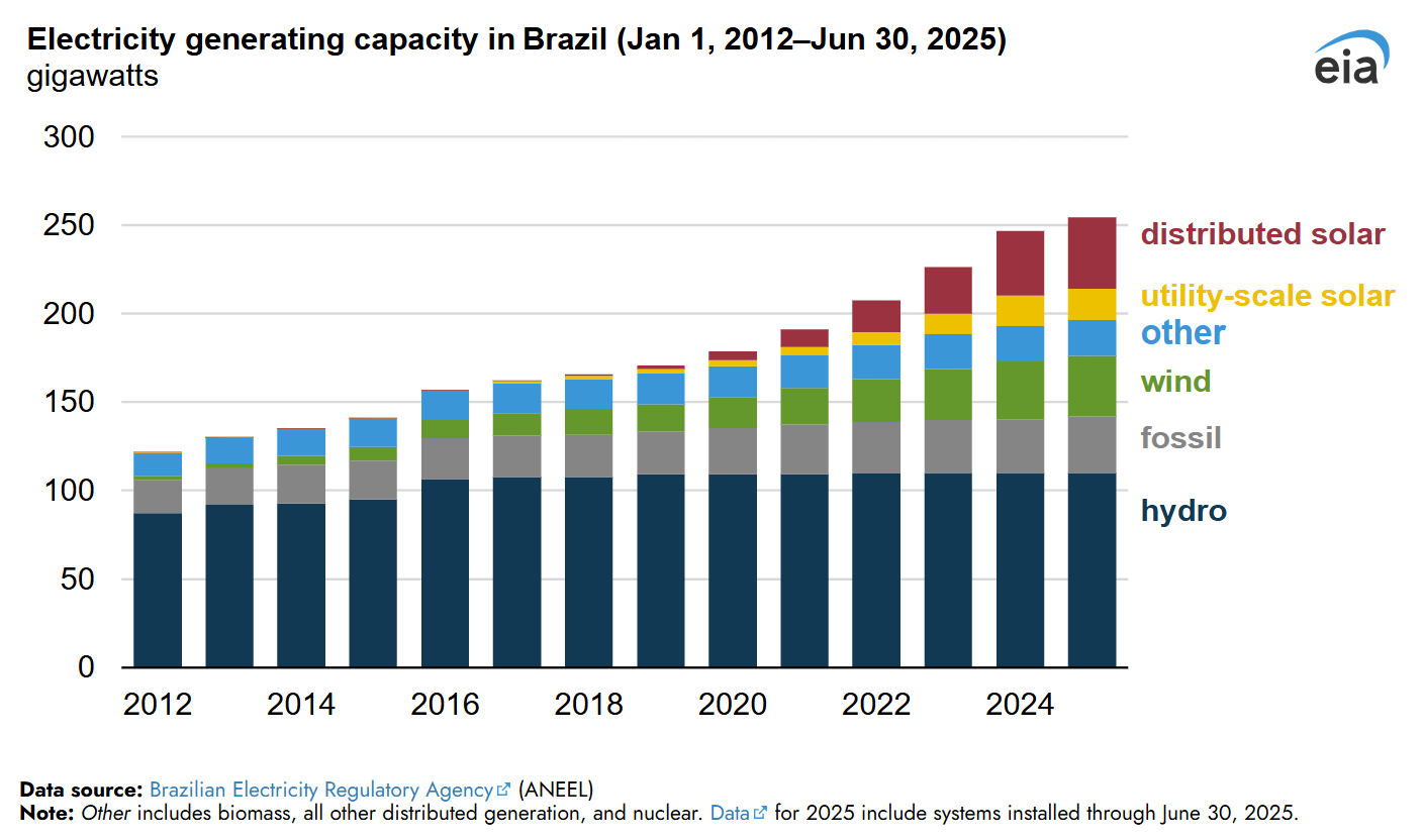 "In 2012, Brazil implemented net metering policies, which have recently contributed to large increases in distributed solar generation capacity. … As of June 30, 2025, total solar electric generating capacity in Brazil was 23% of the total electric generating capacity."