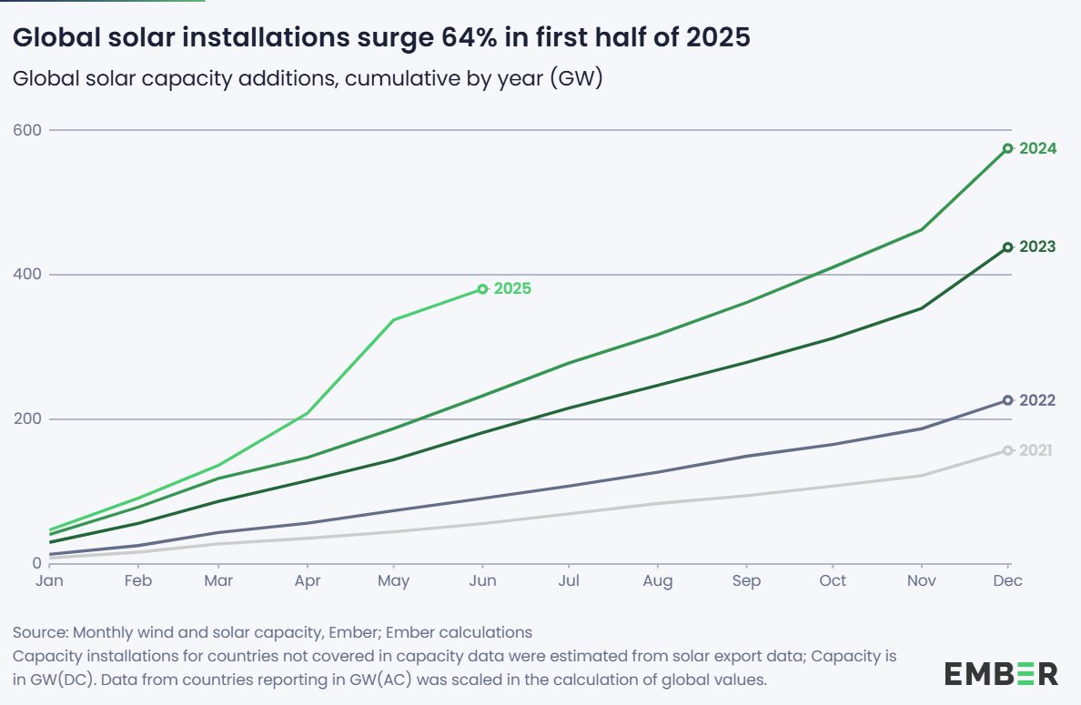 "Global solar installations are on track for another record year," wrote the authors of a report the organization published last month. "In the first six months of 2025, the world added 380 GW of new solar capacity – 64% higher than during the same period in 2024, when 232 GW were installed."