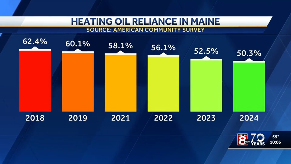 "New federal data from U.S. Census Bureau’s American Community Survey show about half of Maine households still use heating oil as their primary source of heat, but that share has fallen nearly 20% since 2018," reported WMTW's Jon Chrisos this week. "At the same time, electricity use for home heating has nearly doubled."