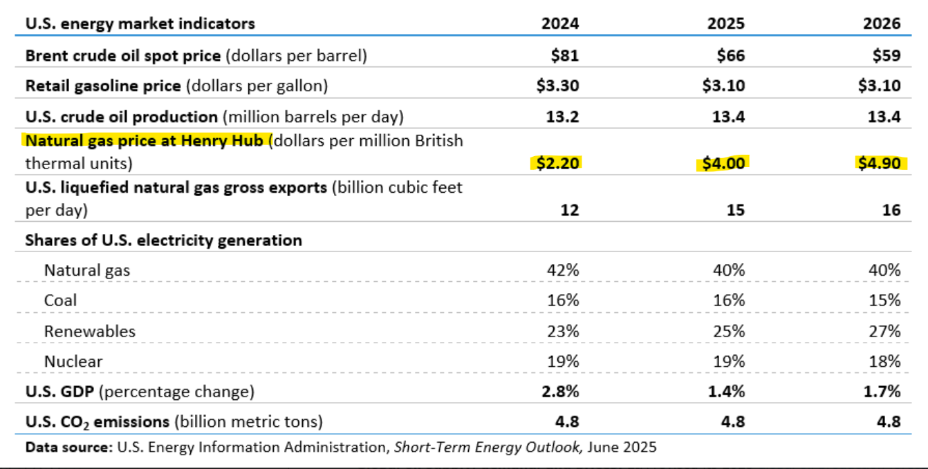 “The Henry Hub spot price in our forecast averages about $4.00 per million British thermal units (MMBtu) in 2025 and $4.90/MMBtu in 2026, compared with $2.20/MMBtu in 2024,” according to the Short-Term Energy Outlook released on June 10.