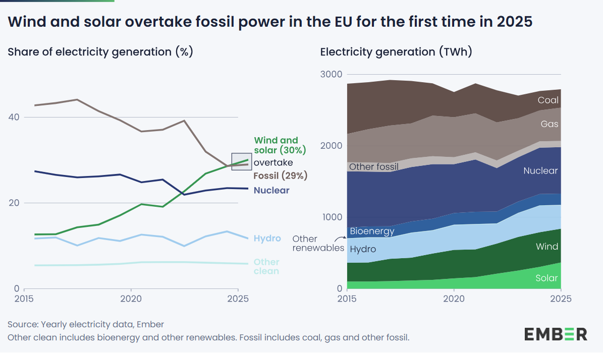 “In 2025, the EU took an enormous step forward towards a clean power system backed by wind and solar,” reports the energy think tank Ember in its latest European Electricity Review. “For the first time, wind and solar produced more electricity than fossil fuels in the EU. Homegrown renewables remained nearly half of EU power, as record-breaking solar worked in tandem with wind.”