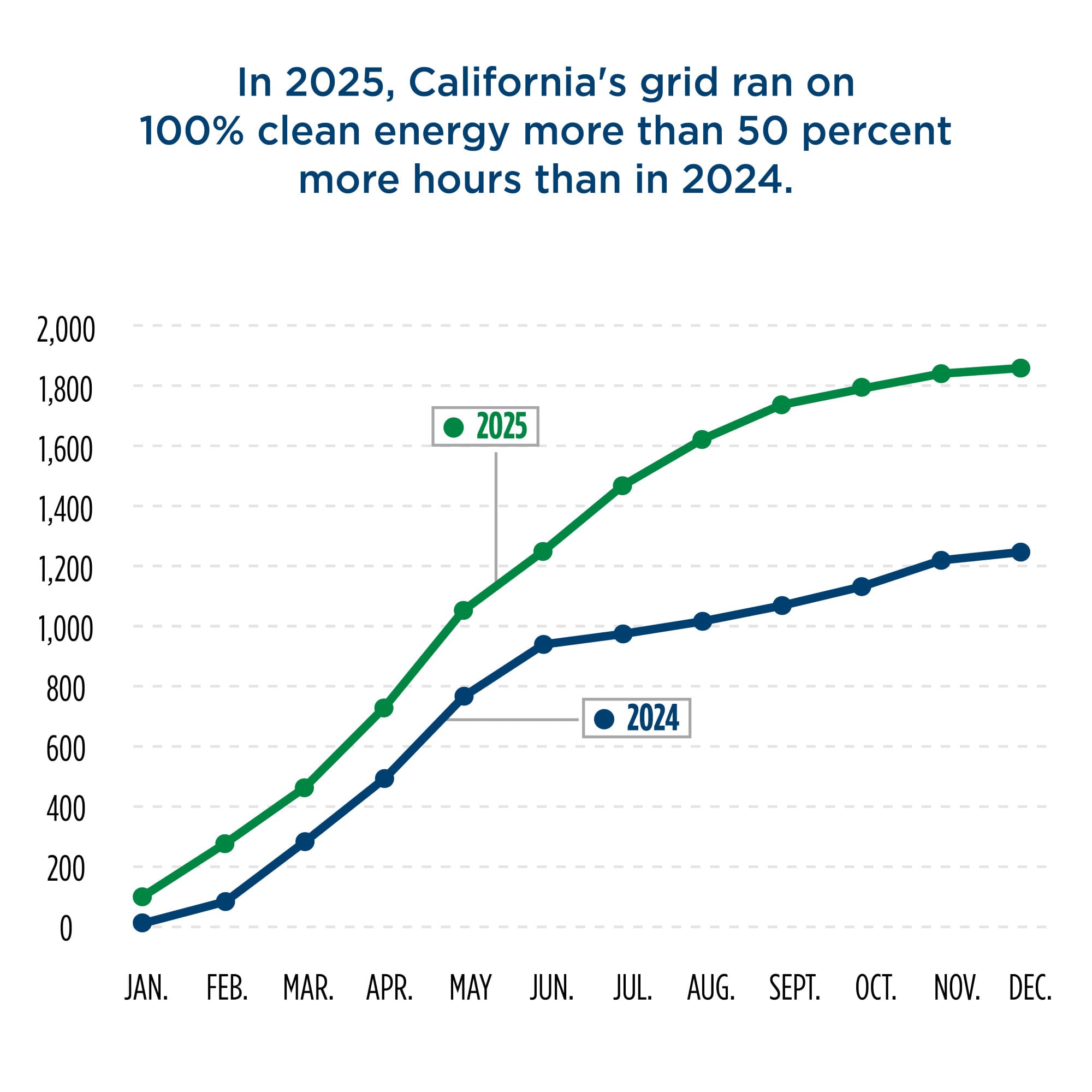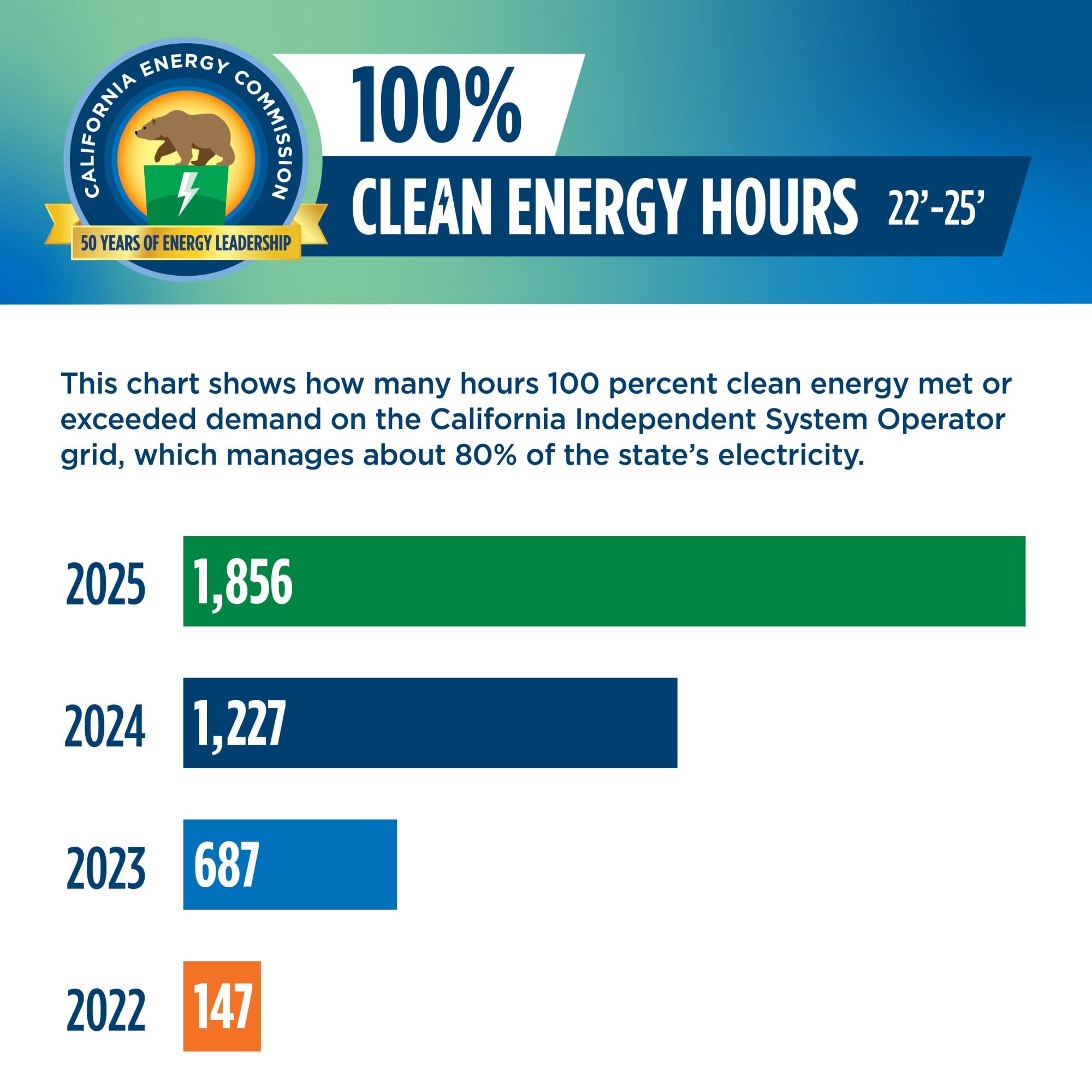 “In 2025, California’s grid ran on 100% clean energy more than 50% more hours than in 2024,” according to the CEC.